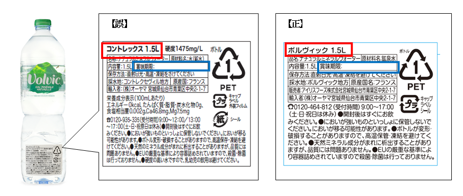 商品下部の品質表示ラベルをご確認ください。正しい商品名は、「ボルヴィック1.5L」ですが、「コントレックス1.5L」の品質表示ラベルが貼り付けられています。また、賞味期限欄(以下青枠内)に「2023.4.24」と記載されております。
